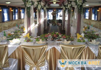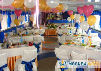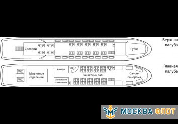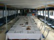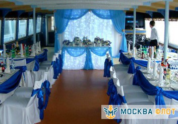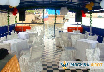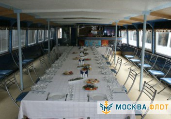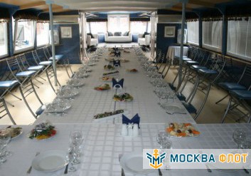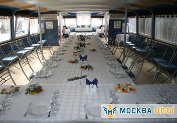Нижняя палуба теплохода располагает вместительным банкетным залом. Здесь установлены шикарные панорамные окна, которые открывают прекрасный вид и зрительно расширяют помещение. Пастельные тона в оформлении ресторана сочетаются с ярким декором морского цвета, что добавляет интерьеру палубы природной естественности и отличного настроения отдыхающим. Классическая меблировка зала будет уместна для любого торжественного или официального случая. Оборудованная в носовой части палубы кают-компания подойдет в качестве места отдыха небольшой компании или для размещения выступающих артистов. При желании можно подышать свежим воздухом на открытой части нижнего этажа. Банкетный зал располагает качественным аудио, видео, световым и климатическим оборудованием для технического обеспечения вашего мероприятия.