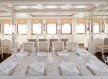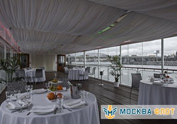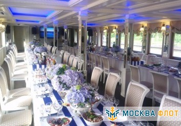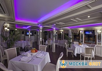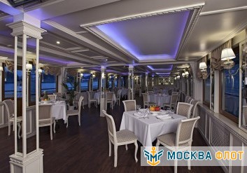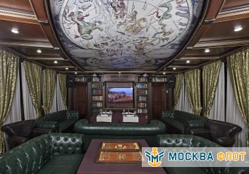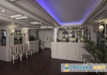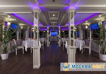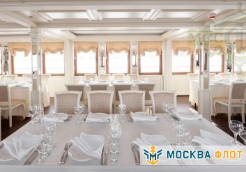 Большой банкетный зал оборудован на первом этаже корабля. Здесь прекрасно сочетается роскошь и простота, что позволит проводить мероприятия на достойном уровне, без излишней помпезности. Светлый зал поражает отдыхающих изяществом пространства, теплотой и уютом. Для оформления помещения выбран цвет слоновой кости, а декор и обивка мебели выполнены в бежевых тонах. На стенах подвешены бра, установлены плазменные экраны, акустическая система и встроены кондиционеры. Зона для отдыха гостей организована и в носовой части палубы с белоснежными креслами и диванчиками.
