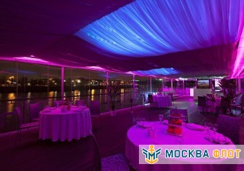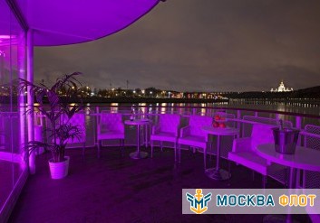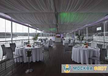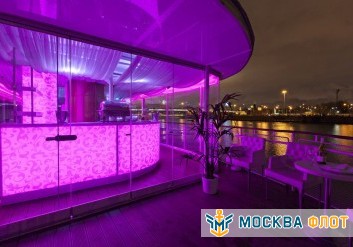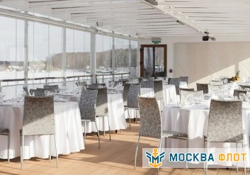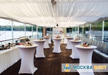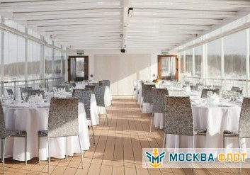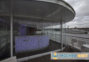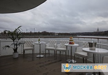 Летняя веранда устроена на верхней палубе и может являться как полноценным банкетным залом, так и дополнительной площадкой для организации дискотеки, фуршета, выездной свадебной регистрации и т.д. По периметру располагается стильная меблировка и размещено звуковое и видеооборудование. Навесная крыша над палубой может быть украшена в различных вариациях.