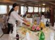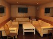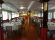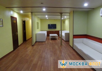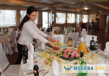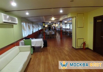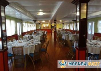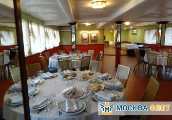 Банкетный зал размещен на главной палубе теплохода. Отделка помещения выполнена с использованием натурального светлого дерева. Практичная и красивая мебель в зале будет расставлена в необходимом вашему мероприятию формате: европейском, буквами «П» или «Т», «театром». Основной цвет помещения - утонченно-спокойный айвори - позволит декорировать, добавлять оттенки в соответствии с вашими предпочтениями. Ресторан обслуживает кухня теплохода с ассортиментом популярных и изысканных блюд. Для приятных бесед и релаксации на палубе устроена лаунж-зона в восточном стиле, укомплектованная мягкими диванчиками, укрытыми парчей, навесным телевизионным экраном с DVD-проигрывателем и разнообразными кальянами.