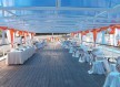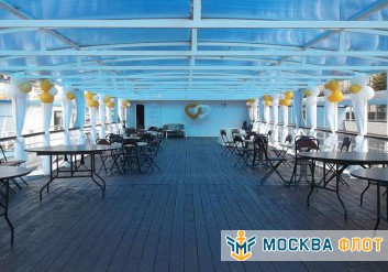 Прогулочная палуба теплохода выполняет роль летнего ресторана. На открытой площадке стоит металлическая мебель для комфортного принятия пищи, напитков и организации различных мероприятий. Защитой палубы служит тентовая конструкция. На ней нет ничего лишнего, это гармоничное и функциональное пространство для отдыха на корабле и вдохновляющие виды за бортом.