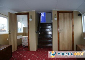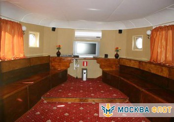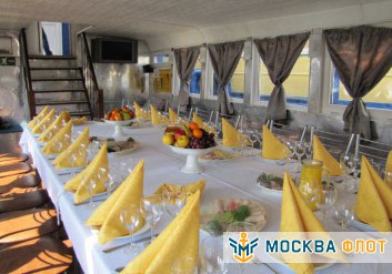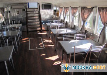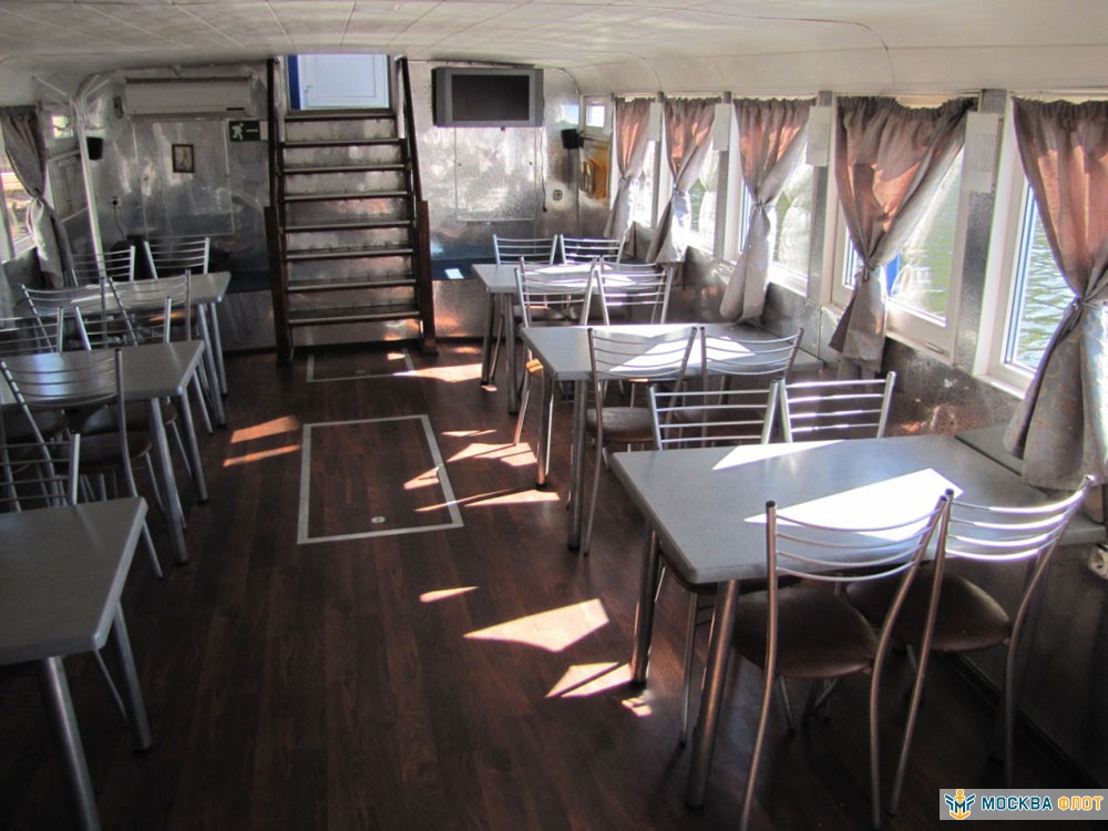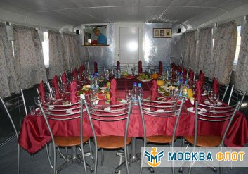 Основная часть банкетов и фуршетов проходит на первом этаже теплохода. Здесь оборудован просторный банкетный зал с панорамным остеклением и классическим ремонтом. С помощью функциональной мебели в помещении легко можно создать необходимую обстановку для любого события. Также здесь расположена уютная кают-компания с меблировкой и аппаратурой с функцией подключения караоке. Для оформления пространства подойдут абсолютно разные варианты декора благодаря нейтральной цветовой палитре зала и отсутствию ярких акцентов. Обеспечение палуб современной техникой и профессиональной аппаратурой дополнят картину комфортабельного отдыха. На корабле работает камбуз, который возможно взять в аренду.